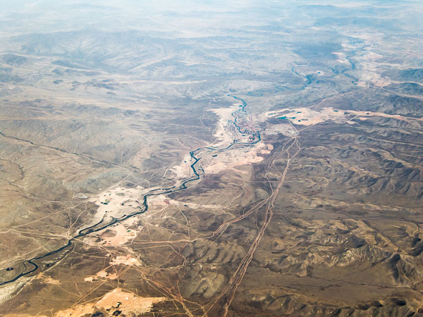 Although our route took us north of the Gobi Desert, it is still very dry. Near Ulaanbaatar there was some farming, but the farther west, the less likely. The last quarter of the flight passed over land that is almost entirely missing signs of habitation—the only marks are those made by water and wind.