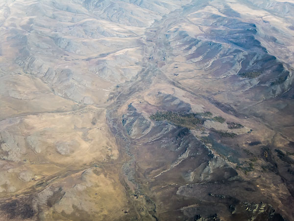 Although our route took us north of the Gobi Desert, it is still very dry. Near Ulaanbaatar there was some farming, but the farther west, the less likely. The last quarter of the flight passed over land that is almost entirely missing signs of habitation—the only marks are those made by water and wind.
