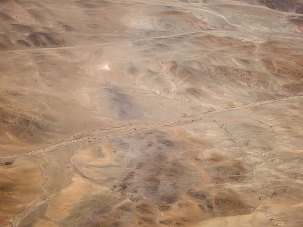Although our route took us north of the Gobi Desert, it is still very dry. Near Ulaanbaatar there was some farming, but the farther west, the less likely. The last quarter of the flight passed over land that is almost entirely missing signs of habitation—the only marks are those made by water and wind.