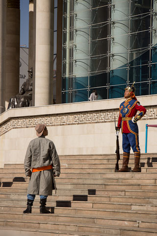 2012-09-29 ~ Walking today. Coffee with Fiona Addleton, the wife of the former ambassador to Mongolia, who gave us information on everything from what kind of Mongolian batteries last longest to the eagle festival in western Mongolia, as well as Tumen Ekh, a traditional Mongolian performance group. Crossing the square with her on the way to the Natural History Museum we came across the Royal Honor Guard, a very lucky encounter from what Fiona told us about them. We also went inside the Government House and saw a National Geographic show of its "fifty greatest photographs." The images were showing the effects of lots of exhibition time, but still remarkable. There was also a drive for new members for a Mongolian issue of National Geographic.