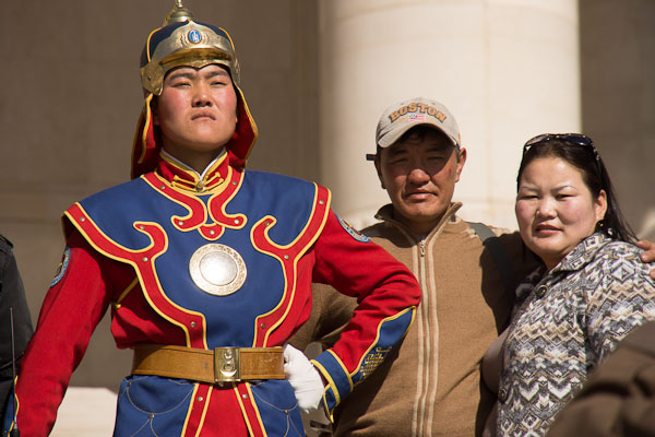 2012-09-29 ~ Walking today. Coffee with Fiona Addleton, the wife of the former ambassador to Mongolia, who gave us information on everything from what kind of Mongolian batteries last longest to the eagle festival in western Mongolia, as well as Tumen Ekh, a traditional Mongolian performance group. Crossing the square with her on the way to the Natural History Museum we came across the Royal Honor Guard, a very lucky encounter from what Fiona told us about them. We also went inside the Government House and saw a National Geographic show of its "fifty greatest photographs." The images were showing the effects of lots of exhibition time, but still remarkable. There was also a drive for new members for a Mongolian issue of National Geographic.