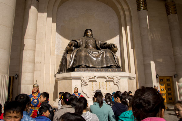 Statue of Chingis Kahn, surrounded by honor guards and onlookers. Government House.