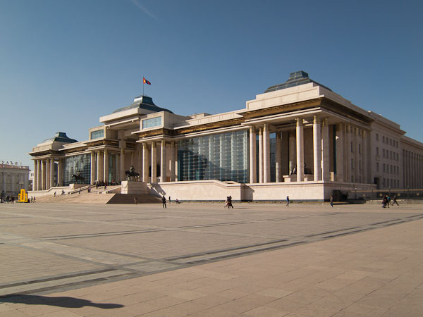 2012-09-29 ~ Walking today. Coffee with Fiona Addleton, the wife of the former ambassador to Mongolia, who gave us information on everything from what kind of Mongolian batteries last longest to the eagle festival in western Mongolia, as well as Tumen Ekh, a traditional Mongolian performance group. Crossing the square with her on the way to the Natural History Museum we came across the Royal Honor Guard, a very lucky encounter from what Fiona told us about them. We also went inside the Government House and saw a National Geographic show of its "fifty greatest photographs." The images were showing the effects of lots of exhibition time, but still remarkable. There was also a drive for new members for a Mongolian issue of National Geographic.