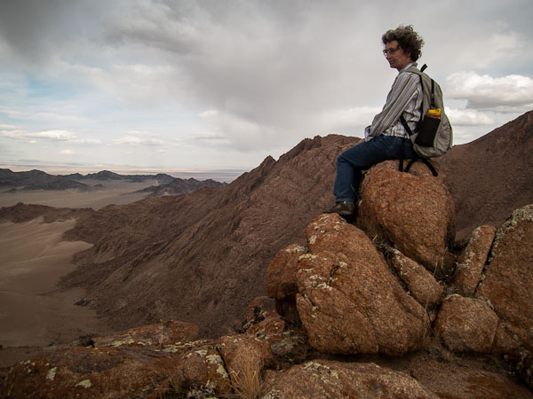 We hiked northeast out of town through what looks like the town dump, climbing gradually until we reached a cemetery. Then up the end of the bowl to a pass where we had lunch and a view north to an area where fields are laid out beside the Buyant River. (There are still cabbages standing. I have been wondering where the food at the market comes from, since it is so dry here.) Then, after lunch, up. We wove our way up the steep side of the ridge to come to a spot where we could see, at the same time, the city behind us and the northern edge of Har Us Lake in front of us in the distance. Between us and the lake were miles of rock and sand. In the flat bottom the river braided its way north and would eventually meet up with the Khovd River before emptying into the lake.