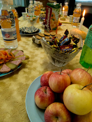 There is some regional variation in the assortment of food for the tables. Apples, yes, but also sausage and pickles as well as sushi rolls.