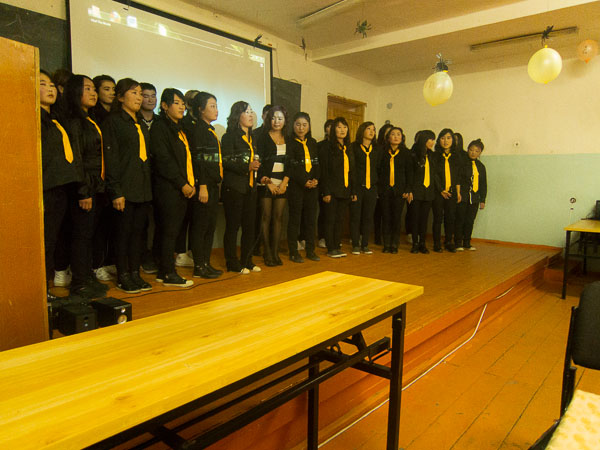 You may be surprised that we celebrated Halloween here yesterday. I certainly was when I got my invitation to the Chinese/English department's annual party. Halloween is not a holiday that is usually recognized in Mongolia, a fact that I was very conscious of as I walked across the main square in broad daylight dressed as a cow. But in the Chinese/English department, it is a way to explain a little bit of American culture to students of English. (Really, how else would you explain it?) Aside from doing a good job of dressing up like Americans, it was an opportunity to perform, as each class put on a dance or sang. In between there were competitions. Stack the nuts with a chopstick, random couples assigned an animal to imitate in the process of mate selection, and my favorite, stick the card in the watermelon. A watermelon is cut in half, each half is set on a table so that the red side faces the contestants, who flip playing cards at it in an attempt to stick them into the flesh. The team that gets all its players to stick a card first wins.