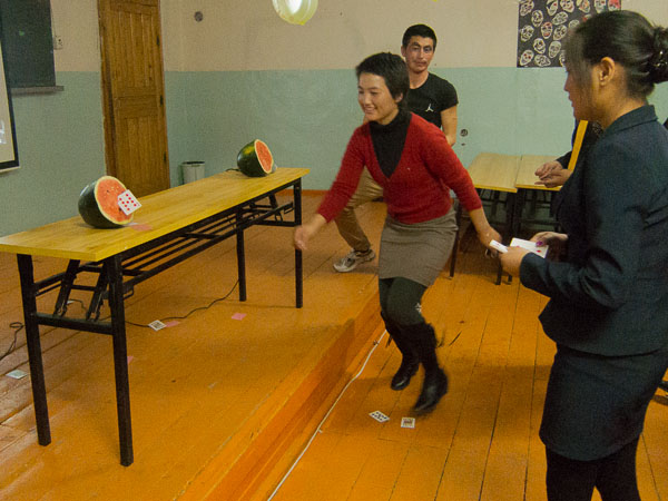 You may be surprised that we celebrated Halloween here yesterday. I certainly was when I got my invitation to the Chinese/English department's annual party. Halloween is not a holiday that is usually recognized in Mongolia, a fact that I was very conscious of as I walked across the main square in broad daylight dressed as a cow. But in the Chinese/English department, it is a way to explain a little bit of American culture to students of English. (Really, how else would you explain it?) Aside from doing a good job of dressing up like Americans, it was an opportunity to perform, as each class put on a dance or sang. In between there were competitions. Stack the nuts with a chopstick, random couples assigned an animal to imitate in the process of mate selection, and my favorite, stick the card in the watermelon. A watermelon is cut in half, each half is set on a table so that the red side faces the contestants, who flip playing cards at it in an attempt to stick them into the flesh. The team that gets all its players to stick a card first wins.