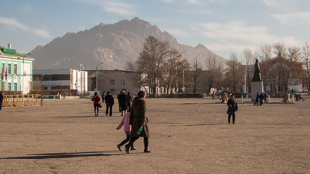 For the past ten years I have commuted between two and five hundred miles a week to my job in Alfred, NY. So ironically, it has been a relief to find myself in Mongolia with less than a ten minute walk to work—close enough to go home for lunch or even just between classes. Most days I make the trip at least twice, and over the past couple of weeks I have made it a habit to stop at the base of a statue at the west end of the Center to take the same view of Khovd's large public square. (At first I thought my students were forgetting something when they wrote that they lived near the Center... “Of what?” I wondered.)