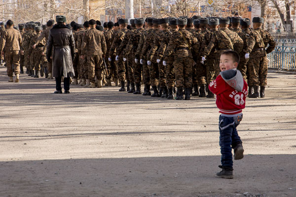 Today is Chingas Khan's 850th birthday, a national holiday here in Mongolia. Schools and businesses are closed, and we have had the day off. I used the morning to catch up on some grading and had planned to work on another notebook in the afternoon. But on my way to the square to get my daily photos I was met by a large celebration. It took a while before I ran into some people I know who could explain that on this day every year new recruits are inducted into the army. Although it is a peaceful country now, celebrating the renewal of the present Mongolian army on the great conqueror's birthday provides a reminder that this was not always the case.