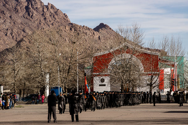 Today is Chingas Khan's 850th birthday, a national holiday here in Mongolia. Schools and businesses are closed, and we have had the day off. I used the morning to catch up on some grading and had planned to work on another notebook in the afternoon. But on my way to the square to get my daily photos I was met by a large celebration. It took a while before I ran into some people I know who could explain that on this day every year new recruits are inducted into the army. Although it is a peaceful country now, celebrating the renewal of the present Mongolian army on the great conqueror's birthday provides a reminder that this was not always the case.