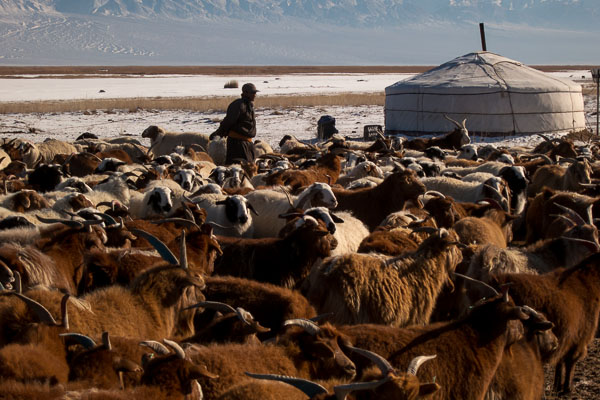 Farther down the road, my students saw a ger that looked inhabited, so our driver simply left the road and headed across snow and the sparse vegetation to give us a look at the process of herding goats and evaluating them for the market. While my students automatically pitched in to help with the herding, I photographed. And photographed. And eventually, was lead to understand that my students did not bring me here just for my pleasure, but that they wanted to talk. And through this negotiation, which started at the goat herd and found resolution as we struggled to understand each other in a van that barreled across the desert, we stopped the van and agreed to meet the driver down the road a way as we walked along the frozen lake shore. For several reasons, it was a good decision.