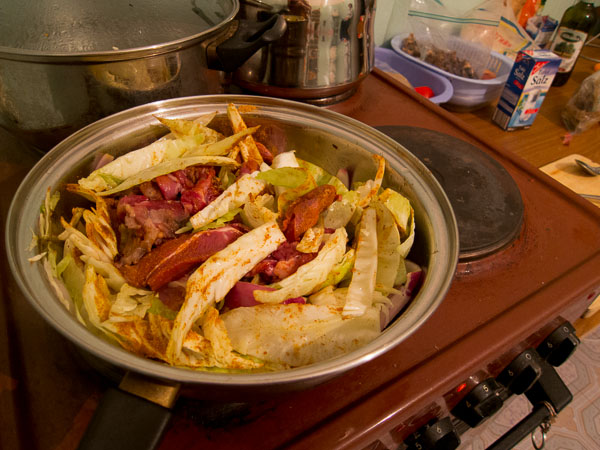 Here's a collection of meals made with these ingredients in our modest kitchen—one thin frying pan and pot that came with the apartment, and a smaller pot that we bought to cook rice. Our tiny sink still doesn't have hot water, making dish washing difficult. And although we have four electric burners, only two work when you turn on the oven. For these reasons, I have been trying to perfect the one-dish meal.