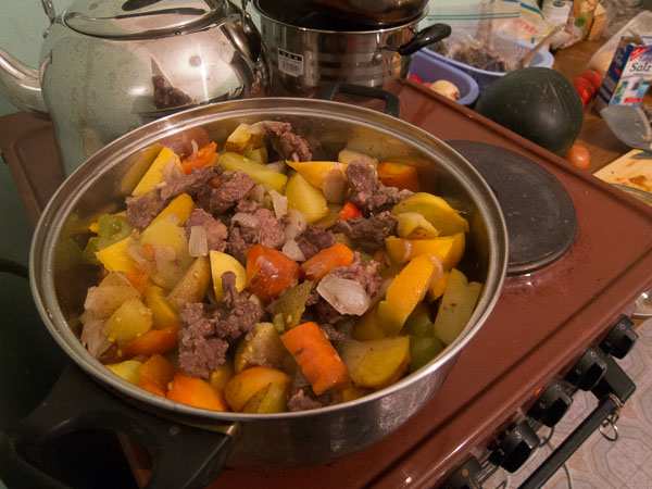 Here's a collection of meals made with these ingredients in our modest kitchen—one thin frying pan and pot that came with the apartment, and a smaller pot that we bought to cook rice. Our tiny sink still doesn't have hot water, making dish washing difficult. And although we have four electric burners, only two work when you turn on the oven. For these reasons, I have been trying to perfect the one-dish meal.