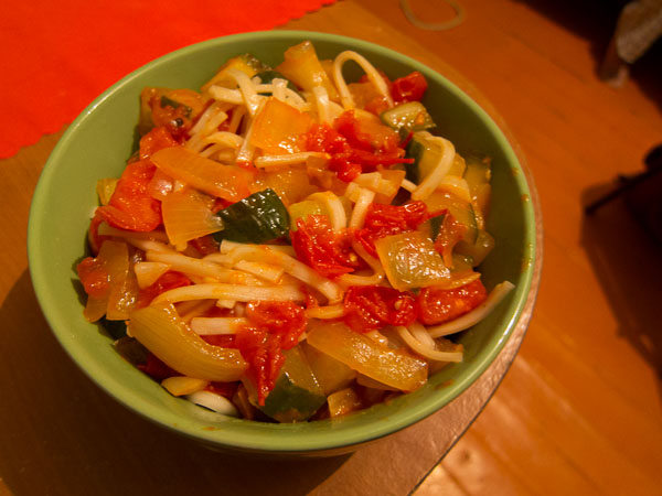 Here's a collection of meals made with these ingredients in our modest kitchen—one thin frying pan and pot that came with the apartment, and a smaller pot that we bought to cook rice. Our tiny sink still doesn't have hot water, making dish washing difficult. And although we have four electric burners, only two work when you turn on the oven. For these reasons, I have been trying to perfect the one-dish meal.