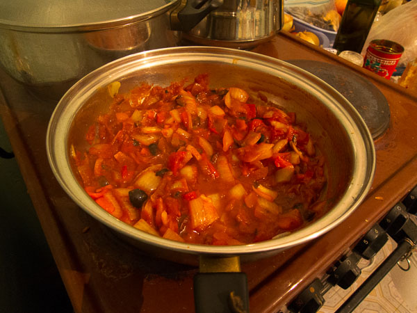 Here's a collection of meals made with these ingredients in our modest kitchen—one thin frying pan and pot that came with the apartment, and a smaller pot that we bought to cook rice. Our tiny sink still doesn't have hot water, making dish washing difficult. And although we have four electric burners, only two work when you turn on the oven. For these reasons, I have been trying to perfect the one-dish meal.