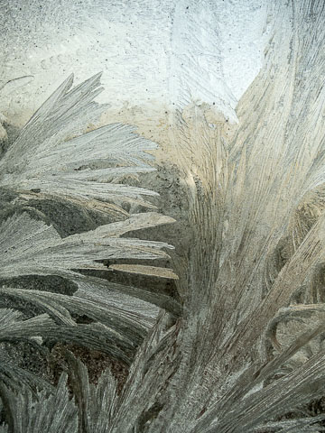 Until then, I have been enjoying the frost that these frigid conditions re-arranges for me every day. These are all images made at a few windows at school, where I take a few minutes between classes to record them. The windows face a central courtyard, which is often visible in the background. The colors change with the time of day and the weather conditions. Also visible are the tape that is used to patch together broken panes and paint splashes on the outside of the glass. Most of these are full-frame images, but for some I can't resist showing you an enlarged detail.
