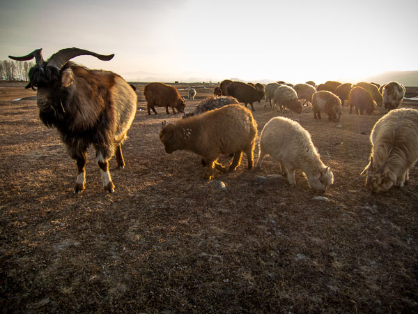 Again, we sit down. This week he is herding goats instead of cows. (I can't explain why... sign language only goes so far.) As I dig into my pack to find his prints, his herd of goats is warming up to me, moving in to see what all the commotion is about. It is windy, and as a kid checks out his prints, the herder drops them on the ground. It is the first time I have ever had goat hooves damage my prints, and my client wasn't even concerned. He picked them up and slid them into the edge of his hat. We got up, and I walked with him for a while, helping to reign in some stragglers and keep them all heading in the same direction. Eventually, it was time to go, so I said my best Mongolian goodbye, pointed back to town, and shook his hand.