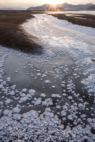 The Buyant River is spilling out of its banks now. The water is freezing into chunks that collect, dam up, and divert the flow over ground that is nearly flat. Although I am within walking distance of the same latitude as Emerson Orchard on Flathead Lake, the weather here comes from Siberia and not the Pacific Ocean, and we are at twice the altitude. During the long nights the temperature has been dropping to -10, -20, and a few nights ago, nearly -30°F. The feeble sun has been bringing the thermometer back above 0°F in the daytime, but not by more than a digit. The water that flows over this ground does not stay liquid for long. Low ground fills with ice, frozen from the surface all the way to the grass or gravel below. Shallow washes created by floods become main arteries as the primary flow is re-routed. They, in turn, ice over, solidify, and divert the water to the next lowest ground. One month ago I could run along the main bank of the river, but now I cannot even find it. On my way out of town to the west, the branch of the river spanned by the bridge is completely dry, reappearing mysteriously a half mile further downstream.