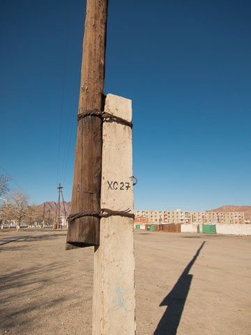 This is how a power pole looks here. A concrete stub is buried in the ground, and a wooden pole is wired to the stub.