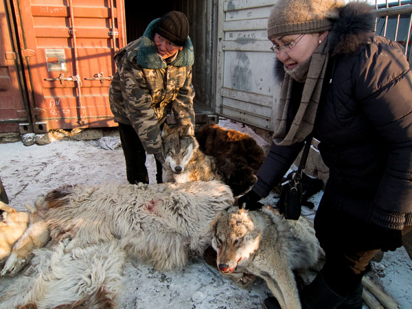 It also seems that good luck is for sale. Having your picture taken with a wolf on New Years Eve is said, at least by one photographer, to be good luck. Ankle bones are sold in gift shops, but the whole wolf can be purchased at the market. And although I have only heard one person support this hunch—"Maybe someone is trying to cheat another person,"—there may even be trade in counterfeit good luck, for that's the only explanation I can imagine for the corpse of a large dog that is missing all four feet. (The difference between a wolf's ankle bone and a dog's may not be detectable to those who are badly in need of good luck. In this case, good luck would be turning four dog ankle bones into 100,000₮.) In addition to the ankle bone, a wolf's meat is thought to be healthy, and the skin is very warm.
