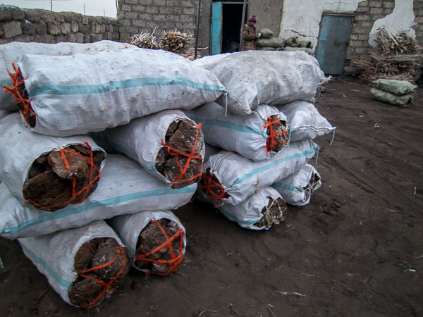 Even in apartments, many people have supplemental stoves to help when the built-in heating is inadequate. Our neighbor bought a large bag of dung and small bag of coal. For those who live in small houses or gers, coal is the fuel of choice.