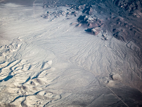 Although the east was cloud-covered, the west was clear, most of it covered with a fresh coat of white snow. Irrigation circles, highways, mountains and canyons, erosion and agriculture—all were articulated in perfectly monochromatic light and shadow, the geometric patterns of human activity contrasting with the random and chaotic patterns of nature.