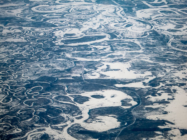 On my way to the US, my flight from Seoul left at dusk, and heading east, it was dark within minutes, so failing to get a window seat was not a serious disappointment. I had a good seat booked from San Francisco, but missed my plane while I was sitting at the gate. I re-booked for the next day, but that flight was delayed and again did not leave till dusk. So except for some time over Mongolia, it was not until my return trip that I found a good enough view to use a camera.