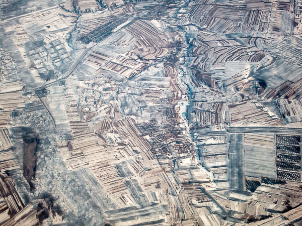 From San Francisco, clouds over the Pacific Ocean toward Alaska, then somewhere near the base of the Aleutian Peninsula, a few holes, showing mountainous terrain if over land, and fractured expanses of ice when over water. The Bearing Sea, the Kamchatsky Peninsula, the Sea of Okhotsk, the geography lesson I missed, unfolding below as the clouds cleared. Landfall at the eastern edge of Russia, where agriculture was sparse and mountains plentiful. Crossing into China the terrain changed again, this time to a much closer fit between human activity and the landscape with fields closely nestled together, following the exact contour of the hillsides. Even here, development has its limits and harsh terrain remains chaotic. Closer to Beijing, development becomes more dense and areas of wilderness become rare. During the last half hour we cross a mountain range, then drop into dense smog.