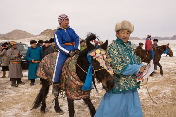 On this first race of the season, spring was just around the corner as light snow lingered on the ground. The race course is a ten kilometer one-way route that is all uphill, across the sand and rock desert that spans most of the western view from downtown Khovd. Registration is somewhere downhill of the halfway point in the race, so when they are ready, riders and horses make their way the three or so miles to the starting line. If there is a minimum size or age for the riders I could not tell what it was. The strategy seems to be the smaller and lighter, the better.