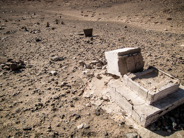 At the top of the draw I started to see headstones that were tipped over, exposing concrete reinforcing rods—though the conditions are harsh, this is not something that is likely to just happen by itself. I had the suspicion that some of these graves had been vandalized. As I looked further, it was not so easy to determine what was going on. Some of the holes in the grave sites looked like those that could be made by an animal. Some sites seemed to be collapsing under the weight of the foot or so of soil that is placed on top of a wooden coffin. But many show the signs of human trespassers. Large stones or concrete slabs have been set aside. Remains have become mixed with empty vodka bottles, an inappropriate end for Muslim Khazakhs who shun alcohol in life.