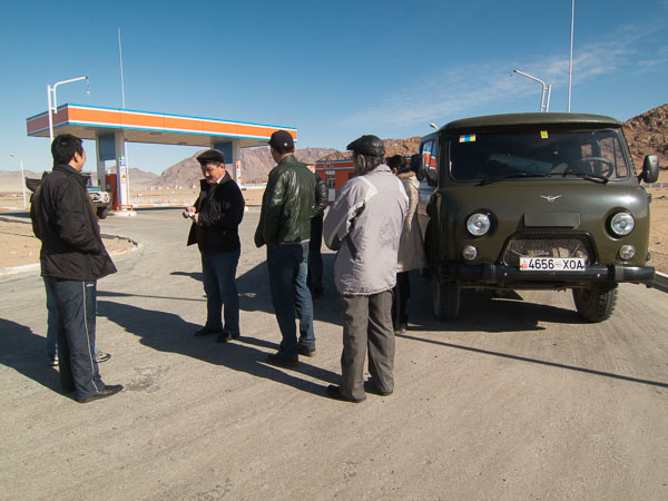 At 8:40 I saw some activity across the street. The Poor-gone arrived fifteen minutes later. At 9:30 there were twelve of us ready to go. We went to the gas station just east of town, and got out. At 10:15 we drove a quarter mile up the road and parked. Someone opened a bottle of vodka, poured a few rounds. At ten thirty the last passengers arrived, with luggage. Fifteen total, and from what I could tell we were packed as full as we could get. But I am not Mongolian. There are twelve seats in this фургон.