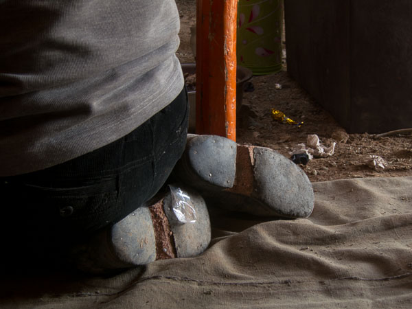 In this ger there are no stools, so people sit in a style that suits their age and flexibility. This is the owner of the ger.