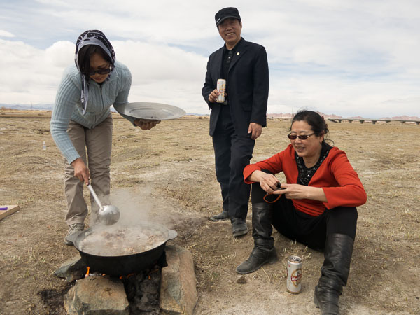 A quick soup takes shape while two visitors from China's Inner Mongolia watch.