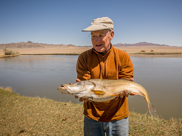 The other trip was made with our neighbor Ojoo, who needed to check on his horses at the place up the Khovd River where they are being cared for by a local family. He asked if we would like to go along for the ride, and also wondered if we would like to try fishing. He didn't need to ask twice. We took along Puje, a graduating senior at our university, to translate for us when needed. He was able to get me onto a horse, and I tried to introduce him to fly fishing. To get to where the best fishing was rumored to be, we forded the river on horseback. The water was deeper than expected, the saddle on Judy's horse came off as the horse climbed the far bank, but the weather was nice so we all dried out quickly. In an attempt to do better for our return crossing our host brought in some camels, who were not easily convinced that carrying people were what they wanted to do that afternoon. Eventually two were cornered, harnessed, and boarded for the crossing.