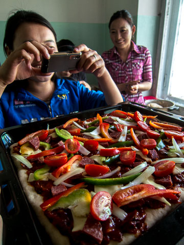 There is not a lot to teach Mongolians about making pizza except to point them in the right direction. All the women and most of the men are competent bakers and handle dough and a rolling pin fluently. We make rectangular pizzas because we have rectangular pans. Once rolled out there is usually a crowd waiting to dress the pizza, and then to have pictures taken with it before it goes into the oven—and more pictures as it comes out.