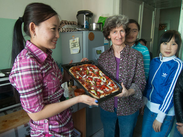 There is not a lot to teach Mongolians about making pizza except to point them in the right direction. All the women and most of the men are competent bakers and handle dough and a rolling pin fluently. We make rectangular pizzas because we have rectangular pans. Once rolled out there is usually a crowd waiting to dress the pizza, and then to have pictures taken with it before it goes into the oven—and more pictures as it comes out.