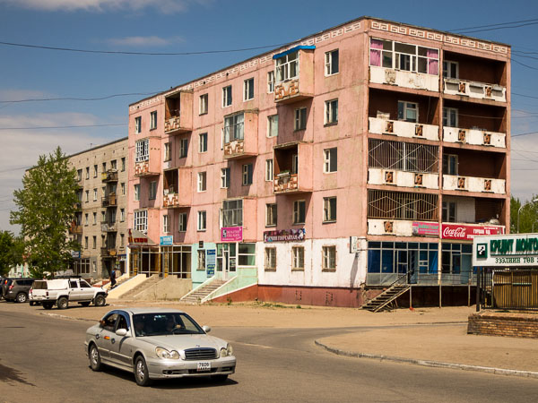 Built by the Soviets as an industrial center, it was a model city in its day. In preparing for our trip we heard over and over again that Darkhan is a city that was planned from scratch. Now that the Russians are gone its architecture is its most distinguishing visible characteristic. While it is finding its own way economically, the legacy of hundreds of old Soviet apartment buildings remain. Most are still occupied, but many appear vacant. On a clear day when most apartments have laundry hanging on the balconies, whole buildings seem deserted.