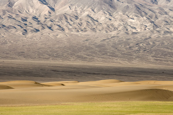 Hovering above Har Us Noor is a long stretch of mountain called Jargalant. When traveling east from Khovd it is the most prominent mass to the north for nearly three hours. From the air it is a long ridge that is banked on both sides in sand, the weathering away of a much higher peak in the past. Like other mountains in Mongolia, it is an uplifting of many different sediment layers, which erode into washes of sand the color of their source rock. So in addition to the knowledge that there are fifteen snow leopards living there, there is the visual treat of looking at how the different colors of sand and rock play out against one another.