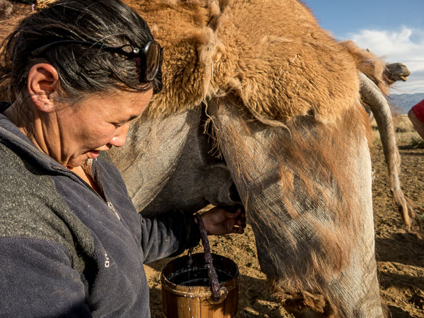 Adult females produce milk, which is used for most of the same things as cow's milk, with at least one notable addition. Areg is milk that is fermented to a sour yogurt or buttermilk taste and a low alcohol content that also produces carbonation—and lots of it when it is kept in a tightly closed bottle. Getting milk from a camel present two problems.