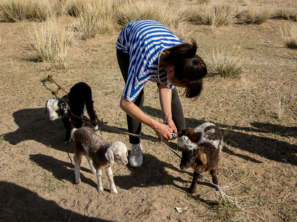 Although we had Naura, a recent graduate with English speaking experience, to translate for us, most of what happened over the weekend didn't need a lot of explanation. We looked at camels and goats and sheep and horses and cows. We ate simple Mongolian food everywhere we went. After milking camels, we stopped to play at some sand dunes. We visited other relatives, drank a little vodka, and then headed across the pasture to where we pitched our tent—among the animals and on top of several layers of thick felt offered to us by our hosts. Most of the rest slept in the ger, though three adults found more felt and blankets and moved out into the open with us.