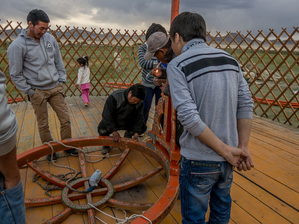 Then there is the fact that this is a city ger, which means that it has a wood floor that raises it above the soil and makes a surface that is easier to set furniture on. The floor is nailed together in large sections, which would challenge even a camel, so getting them out of storage and on to the truck was quite a job.