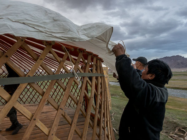 Then there is the fact that this is a city ger, which means that it has a wood floor that raises it above the soil and makes a surface that is easier to set furniture on. The floor is nailed together in large sections, which would challenge even a camel, so getting them out of storage and on to the truck was quite a job.
