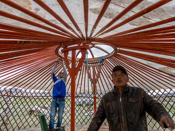 Then there is the fact that this is a city ger, which means that it has a wood floor that raises it above the soil and makes a surface that is easier to set furniture on. The floor is nailed together in large sections, which would challenge even a camel, so getting them out of storage and on to the truck was quite a job.
