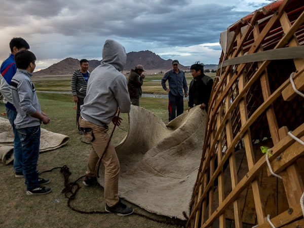 Then there is the fact that this is a city ger, which means that it has a wood floor that raises it above the soil and makes a surface that is easier to set furniture on. The floor is nailed together in large sections, which would challenge even a camel, so getting them out of storage and on to the truck was quite a job.