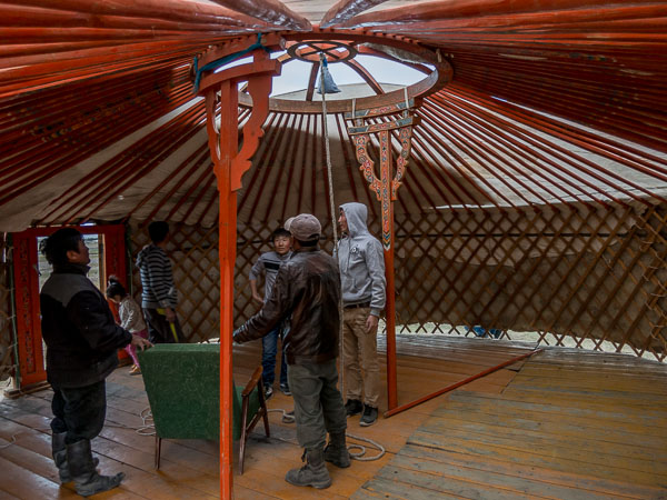 Final adjustments are made by sending someone up on top. Being the smallest, Erdenbat is elected. He seems like he has done this job many times before.
