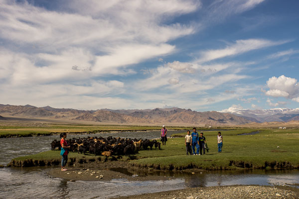 By morning the sky had cleared and we hiked back in crisp weather for most of the morning, crossing the branches of the Buyant, climbing the back of The Nose we had come to see behind, and dropping back down to the river's plain. As we neared Khovd's bridge in mid-afternoon, there was more thunder, then rain and hail. As an appropriate ending to our stay in Mongolia, a family in their Land Cruiser pulled over and gave us a ride for the last mile home.
