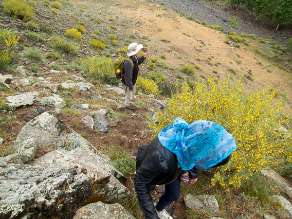 Windows were broken by vandals, paint peeled from neglect, and whole buildings seemed abandoned. But outside teenagers played basketball and volleyball and in the room next to ours old men drank vodka and sang. On our first day, Judy and I hiked up next to the small river, through tall grass and wildflowers that included wild peonies, poppies, and columbine. Rain and mosquitoes (along with a power outage that would last our entire stay and probably well beyond) sent us to bed early, and we woke to more rain the next day—not quite fair we thought, given that half the rain we have seen in the past nine months has happened on our two camping trips. But it only started as a sprinkle, something that we didn't let get in our way. With Muugii, our translator and recent graduate from our university, we climbed the ridge that sits across the river from our camp—four hours to the top and one back down the quick way in rain that had picked up.