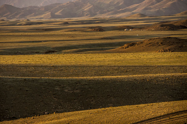 My anticipation of our tour to the Гов was flavored by by everything I thought I knew about it—from the reading I've done, but also from the pictures I've seen. You have seen the same pictures, and so you have the same impression I did. Sand dunes, camels, heat waves shimmering on the horizon creating patches of large and temporary lakes that disappear when you approach. So let me tell you a secret about what we call the Gobi Desert and what Mongolians just call the Gov. (It rhymes with rove.) Most of it looks like the rest of Mongolia, but bigger—sandy, gravelly, or rocky soil, distressed uplifts of solidified sediment, eroded silt from a long ago lake bottom, and sparse vegetation of grass and sage-like plants which, at this time of year, give the land a pale green haze.