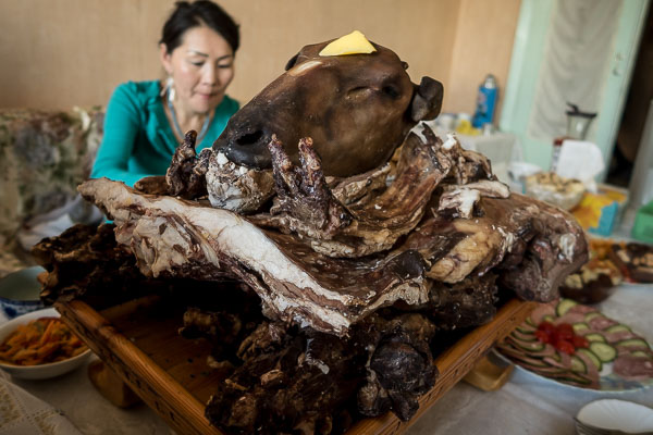 Much of the ceremony though seems to be known only by the oldest members of the family. In addition to the ul boov, the odd-number-of-layers stack of fried bread, on each table there is a stack of meat, mostly from a sheep, that is topped with the sheep's head, which may then be decorated with a pat of butter. Over and over we have heard of the importance of this stack of meat, and of the importance of its exact arrangement and stacking order. When we ask what that order is, or what it symbolizes, we are, with few exceptions, met with a stumped expression. Most of the people we asked, all relatively young, do not know the details, only that it is important and that it is traditional. Each has relied on the last members of the older generation within their family to take care of the details, and in both of these families, the oldest member has already been widowed. Beautiful as these traditions are, some of them are sitting on fragile ground.