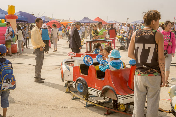The clear weather from the day before was being pushed out, chased by stiff winds that picked up dust and sand thickening the air with a brown haze. At the Naadam field, cars broke from the paved road to criss-cross the hillside away from the official parking area (with paved lanes between parking rows) toward the unofficial parking area a half mile closer, jockeying for the best position for the hike over the hill and down to the race's finish line. Along the way were food vendors, (mostly huushuur, a traditional flattened dumpling that is fried) t-shirts, carnival rides, and shooting galleries. The dust gave everything a surreal look, not least because everyone was under a strain to actually be enjoying the celebration. Tourists with expensive cameras struggled to keep them covered, people with hats walked with one hand on their heads. Exposed skin that was not perfectly dry turned the accumulated dust dark, decorating the corners of eyes, noses and upper lips on foreigners and natives alike.